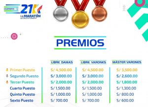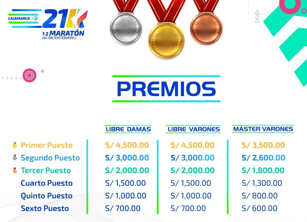 El Gobierno Regional de Cajamarca, organizador del evento, premiará con 36,000 soles a los triunfadores de la Media Maratón del Bicentenario 21k. Los ganadores de la prueba en varones libre y dama libre, ganarán 4,500 soles cada uno, mientras, los que logren los segundos puestos recibirán 3,000 soles, quienes lleguen en tercer lugar, 1,500 soles, los que logren la cuarta posición 1,500 soles para los quintos puestos y 700 soles para los sextos puestos.